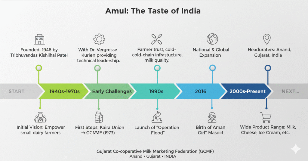 Marketing Milestones: Amul Girl campaign, “The Taste of India” tagline, strong emotional branding.