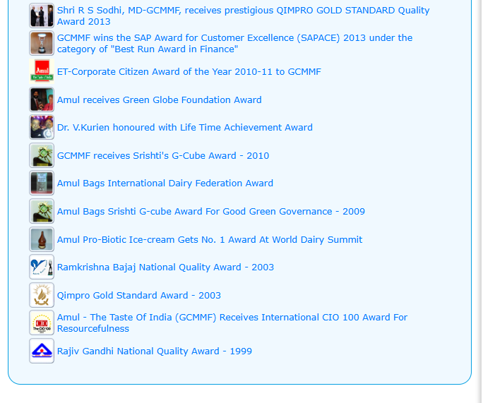 Their are so many awards and certification received by amul as per mention on their site as on date some of listed below and others sharing and others are mentioned in the image