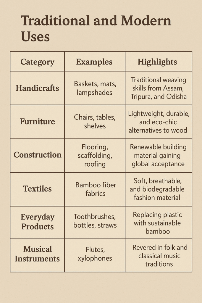 - Ancient Roots: Used in rural housing, tools, musical instruments, and crafts across tribal and northeastern regions.