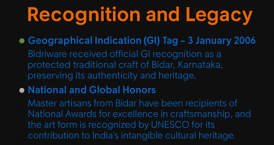 Bidri artifacts grace royal collections, museums, and diplomatic gifts, symbolizing India’s refined craftsmanship and cultural pride.