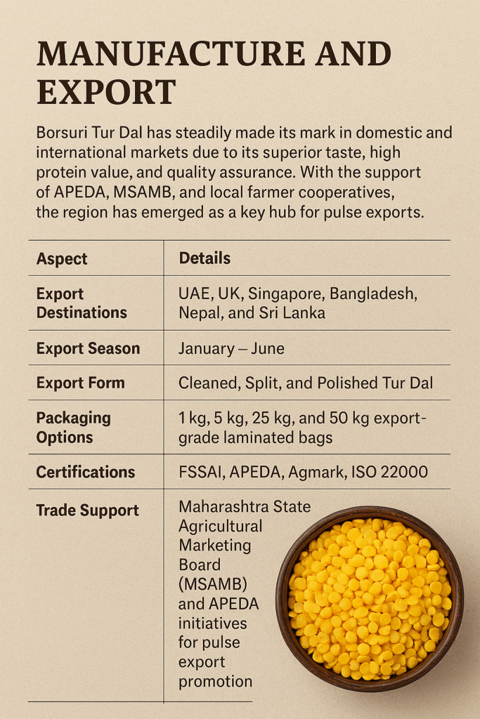 Borsuri Tur Dal has steadily made its mark in domestic and international markets due to its superior taste, high protein value, and quality assurance. With the support of APEDA, MSAMB, and local farmer cooperatives, the region has emerged as a key hub for pulse exports.