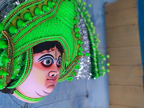 Each mask is designed with strict stylistic rules—for instance, Krishna is always blue, Rama green, female gods pink, and demons often painted in darker shades with fierce expressions.