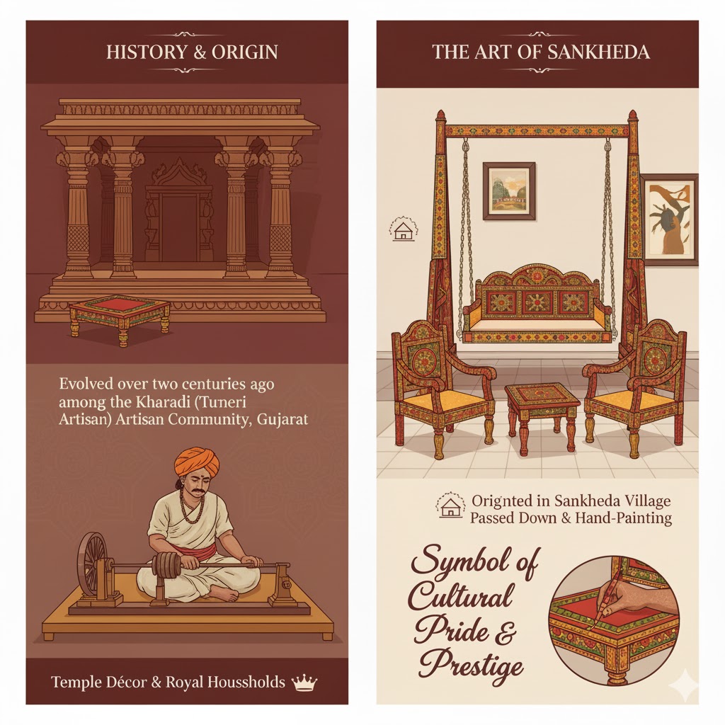 The art of Sankheda furniture-making is believed to have evolved over two centuries ago among the Kharadi (turner) artisan community of Gujarat. The craft was initially confined to temple décor and royal households but gradually became a symbol of cultural pride and household prestige.