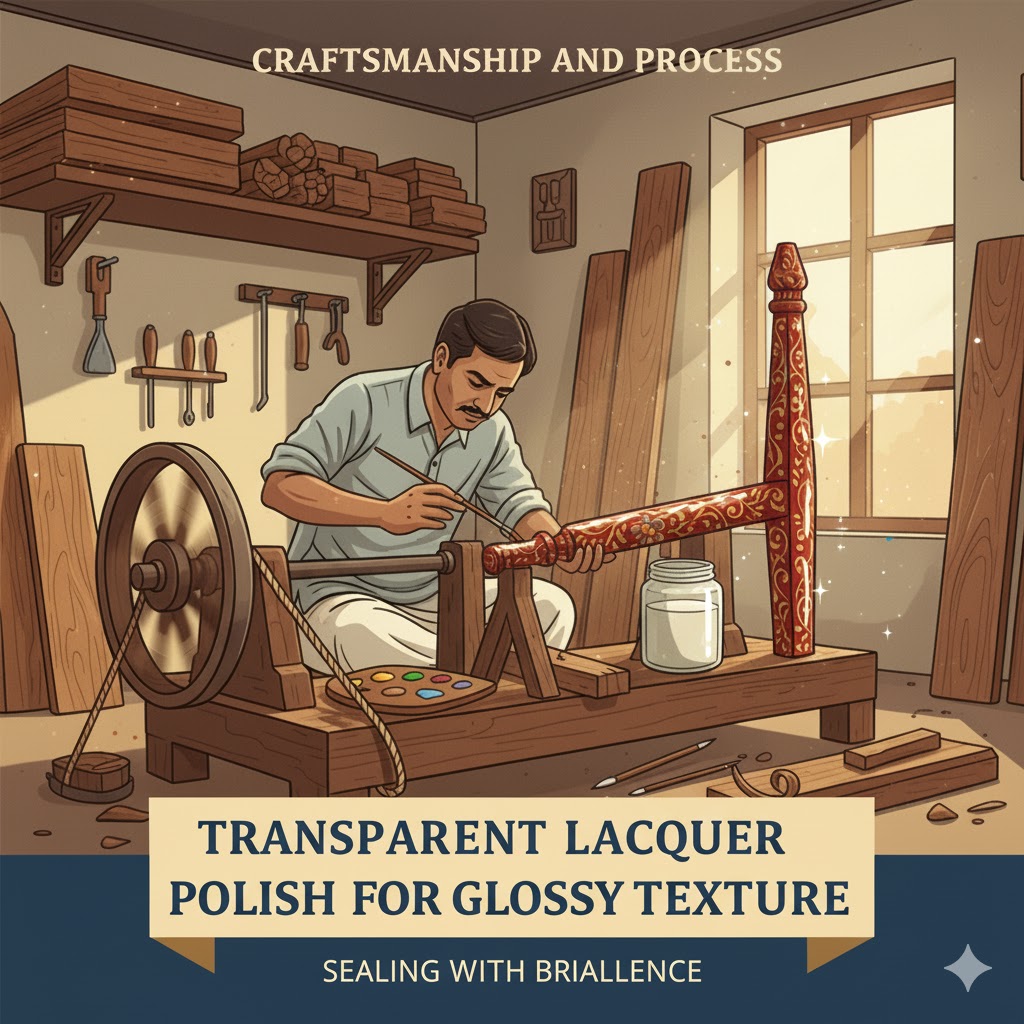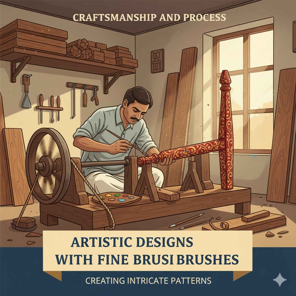 Sankheda furniture is primarily made from seasoned teakwood, shaped and turned using traditional lathes. The wood is then coated with lacquer mixed with natural or chemical pigments. Artisans create floral, vine, and geometric designs using fine brushes — often made of squirrel hair — and finish the surface with a transparent lacquer polish for a rich, glossy texture.