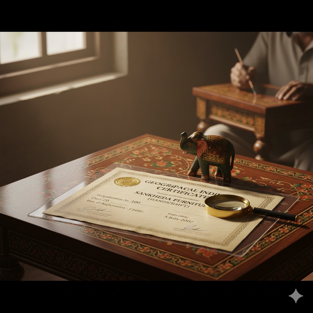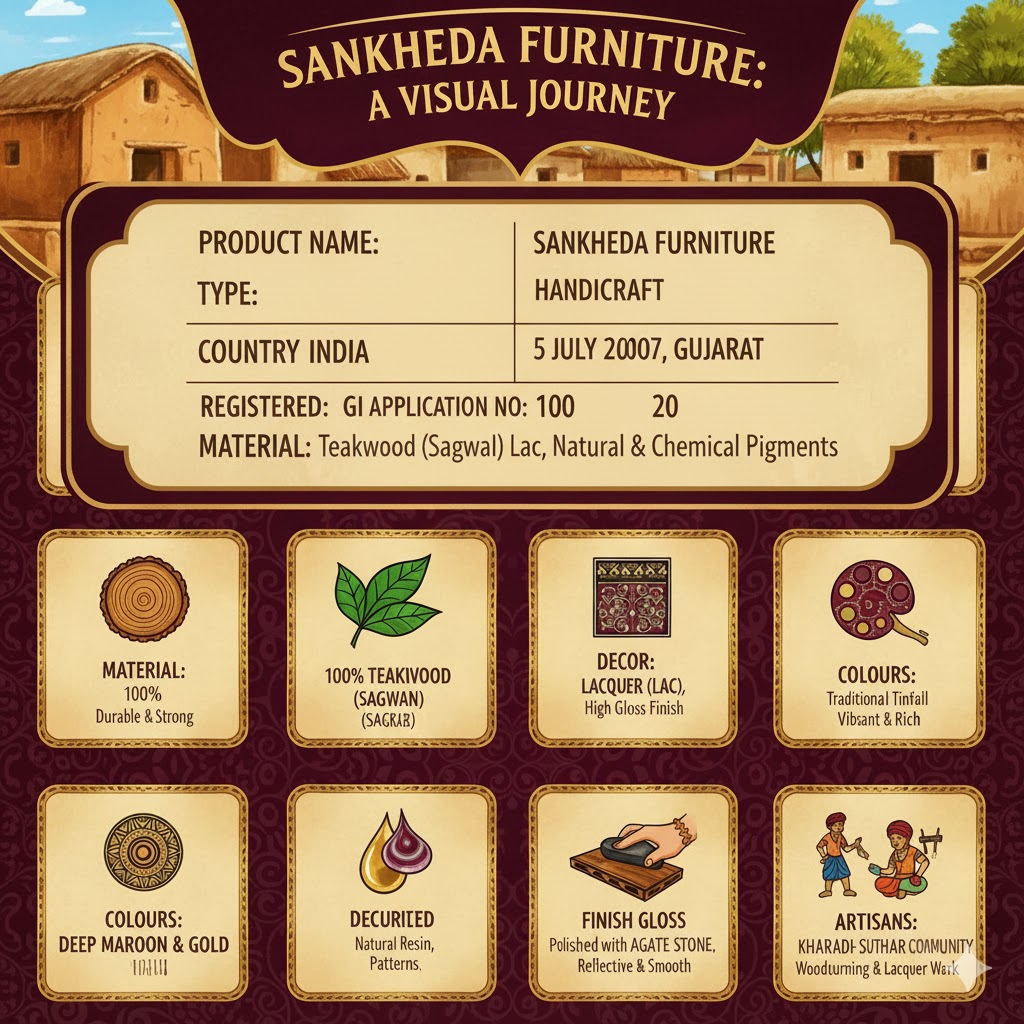 Sankheda Furniture is protected under the Geographical Indications of Goods (Registration & Protection) Act, 1999). It was officially registered on 5 July 2007 under GI Application No. 100 (Class 20) as a handicraft item.