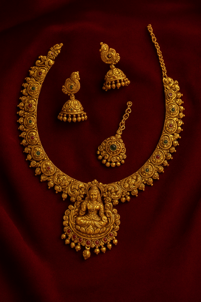 | Lakshmi Haram (Long Necklace) | Temple and bridal wear | Central image of Goddess Lakshmi symbolizing prosperity |